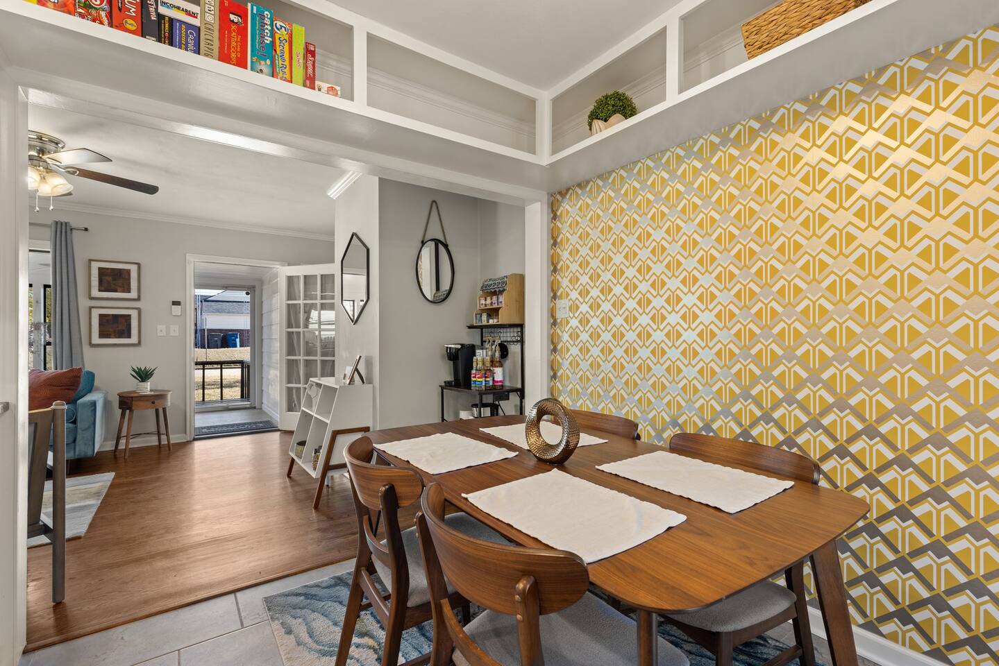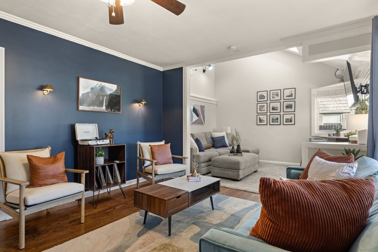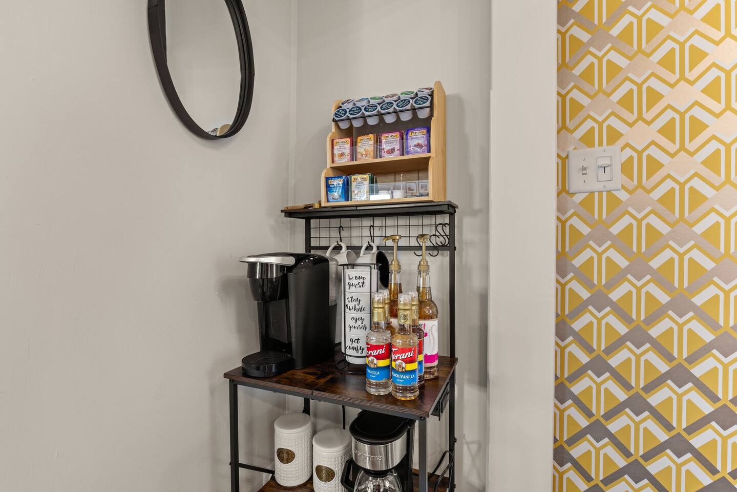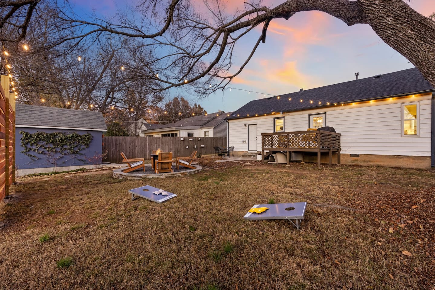 ~Living room~ There is a large smart TV that allows for unlimited streaming. There are two comfortably sofas, one of which is great for stretching out and relaxing like you are at home. WIFI- compatible with working remotely. Plenty of seating for all guests. There is a record player with fun albums available. plenty of throw pillows and blankets. Two additional blankets for your pet and an available dog bed if needed to have a nice space for your pet to rest near you. (Please note the fireplace is not functional) ~Kitchen & Dining~ Fully equipped kitchen, with every item we could think of to include to accommodate your stay. Fully stocked coffee & tea bar is included. variety of coffees including decaf, tea, honey, flavors, honey, cream, splenda and sugar. Board games stored in shelving in dining room. ~Bedroom One~ Queen size, very comfortable bed, closet, dresser, night stands, ceiling fan, chair, lamps. Accommodates 2 guests ~Bedroom Two~ Full over full trundle bed (two mattresses), very comfortable mattress, closet, ceiling fan, chair, lamp. Accommodates 4 guests. Playpen stored in this closet. ~Full Bathroom~ Located in the hall between two rooms. hairdryer available. Shower/tub located in the bathroom. ~Laundry room~ Washer and dryer with soap available for a few washes if needed as well as an iron. There is a small vacuum. mop and broom here. This room is just off of the Kitchen and located inside the home. Cornhole stored in laundry room. ~Outdoor Space~ Small deck off of kitchen, outdoor string lights, decorative privacy fencing. Fully fenced backyard. three different seating areas. Easy start firepit and propane BBQ grill just off kitchen on deck. Cornhole for a little fun is available. This is a very relaxing space after a busy day!