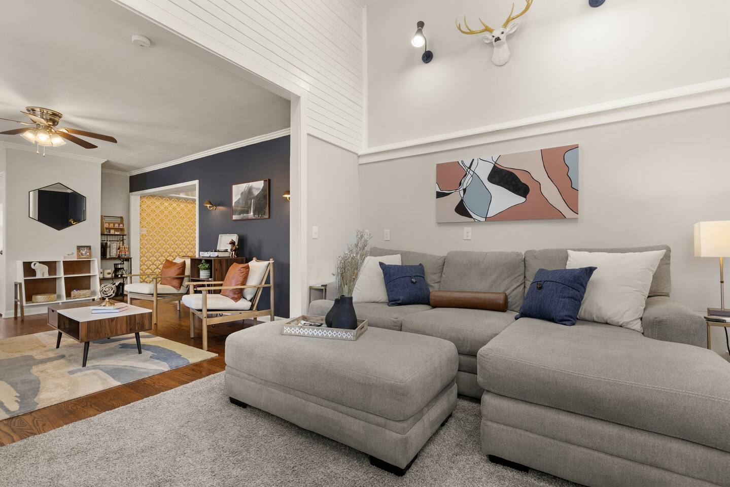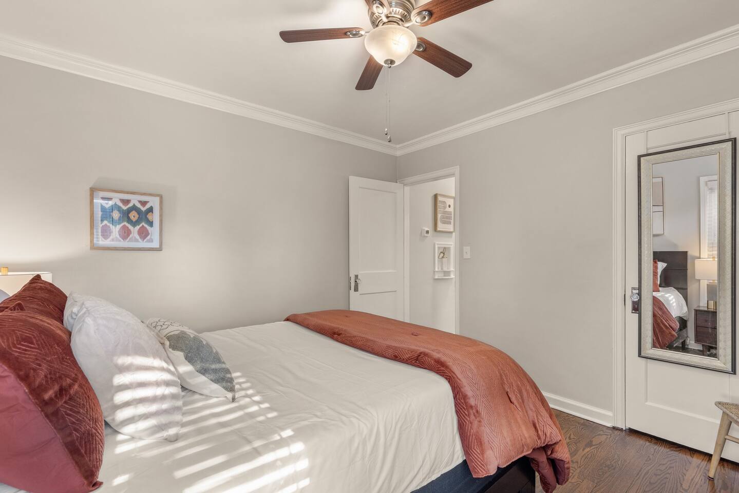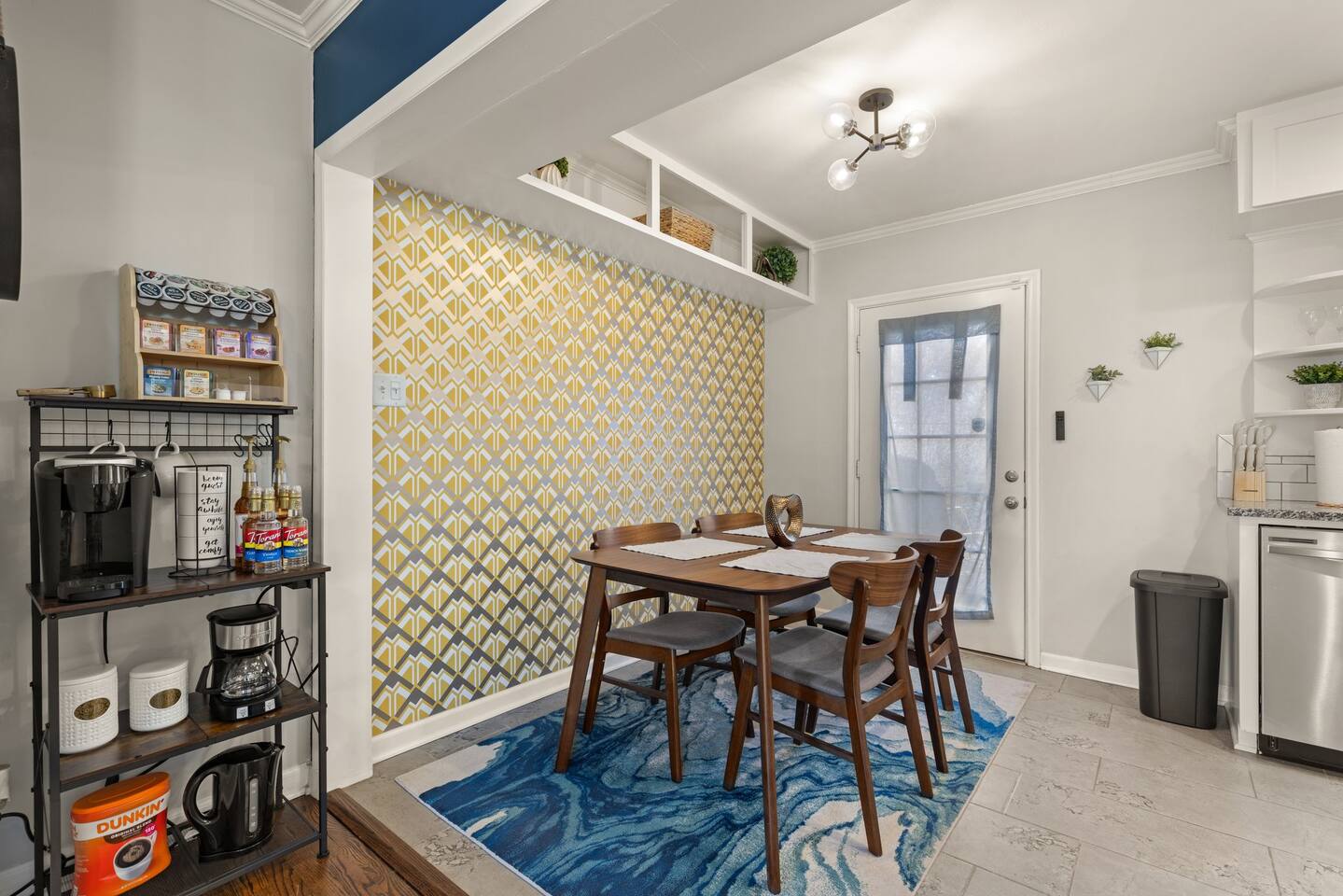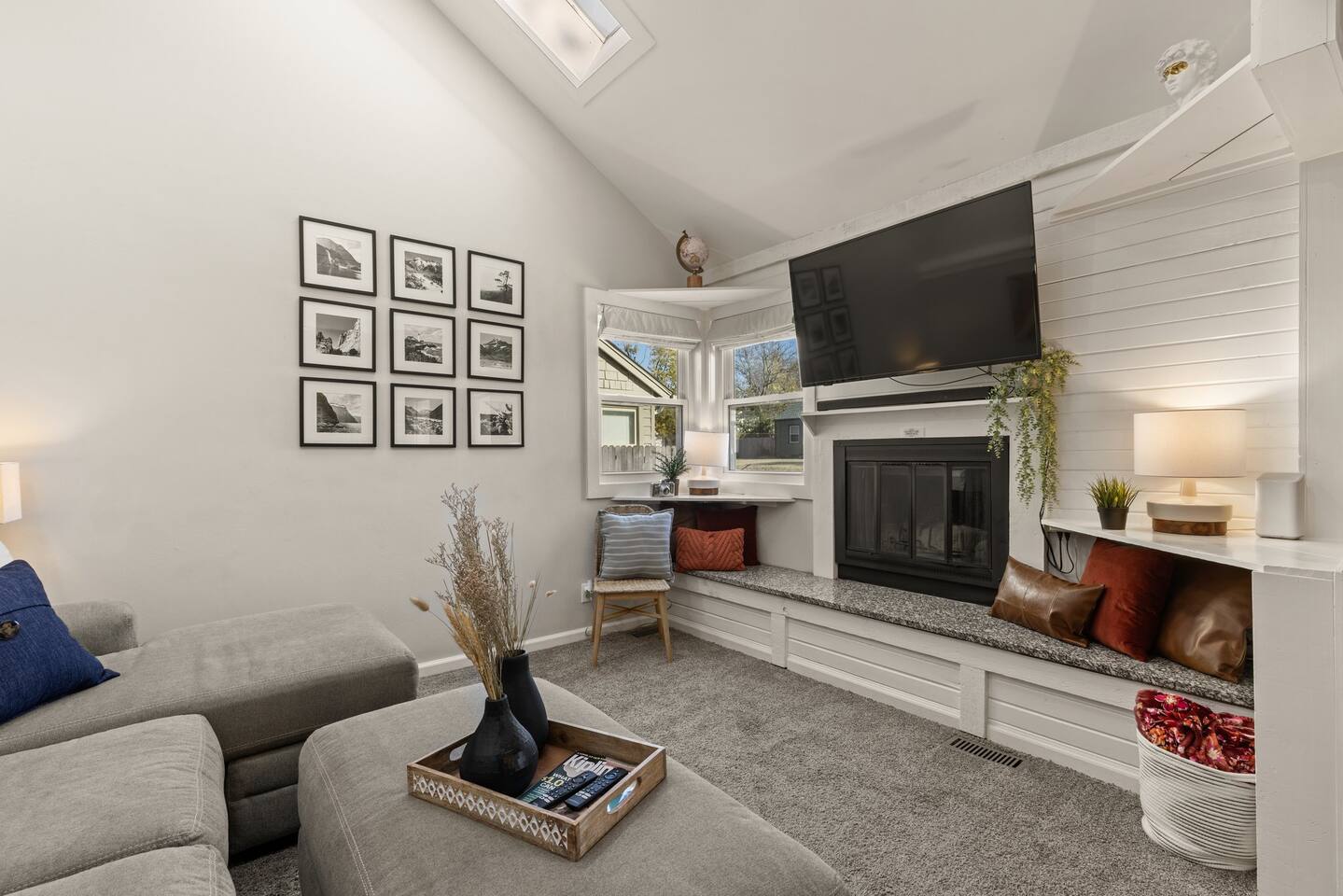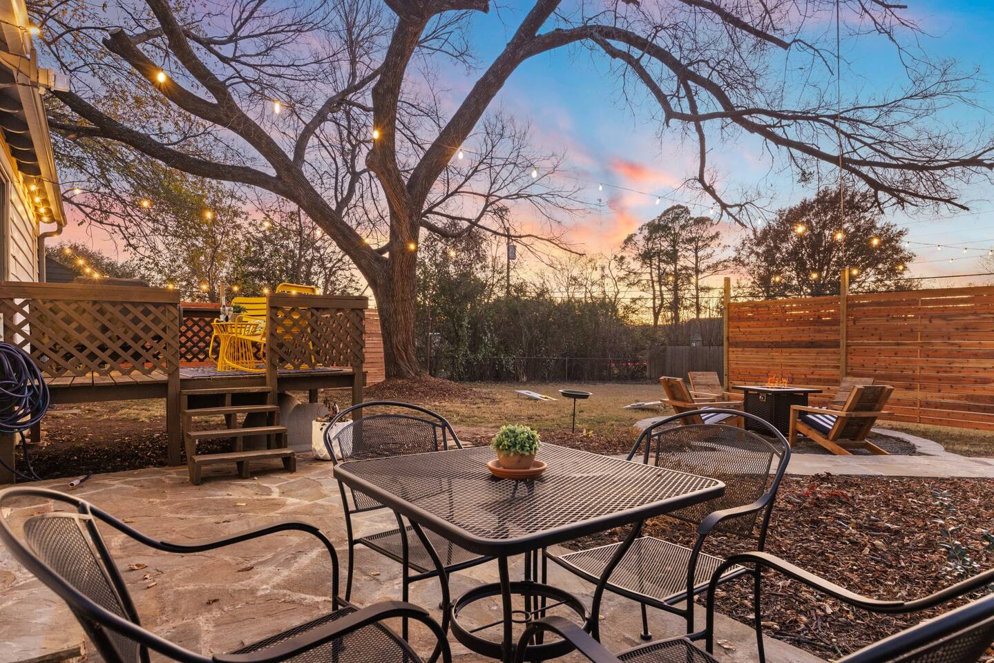 ~Living room~ There is a large smart TV that allows for unlimited streaming. There are two comfortably sofas, one of which is great for stretching out and relaxing like you are at home. WIFI- compatible with working remotely. Plenty of seating for all guests. There is a record player with fun albums available. plenty of throw pillows and blankets. Two additional blankets for your pet and an available dog bed if needed to have a nice space for your pet to rest near you. (Please note the fireplace is not functional) ~Kitchen & Dining~ Fully equipped kitchen, with every item we could think of to include to accommodate your stay. Fully stocked coffee & tea bar is included. variety of coffees including decaf, tea, honey, flavors, honey, cream, splenda and sugar. Board games stored in shelving in dining room. ~Bedroom One~ Queen size, very comfortable bed, closet, dresser, night stands, ceiling fan, chair, lamps. Accommodates 2 guests ~Bedroom Two~ Full over full trundle bed (two mattresses), very comfortable mattress, closet, ceiling fan, chair, lamp. Accommodates 4 guests. Playpen stored in this closet. ~Full Bathroom~ Located in the hall between two rooms. hairdryer available. Shower/tub located in the bathroom. ~Laundry room~ Washer and dryer with soap available for a few washes if needed as well as an iron. There is a small vacuum. mop and broom here. This room is just off of the Kitchen and located inside the home. Cornhole stored in laundry room. ~Outdoor Space~ Small deck off of kitchen, outdoor string lights, decorative privacy fencing. Fully fenced backyard. three different seating areas. Easy start firepit and propane BBQ grill just off kitchen on deck. Cornhole for a little fun is available. This is a very relaxing space after a busy day!