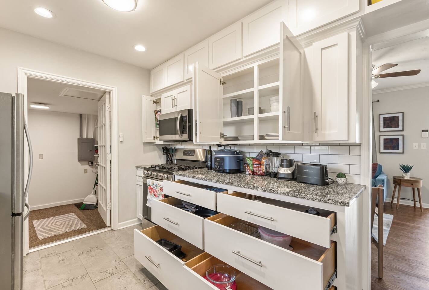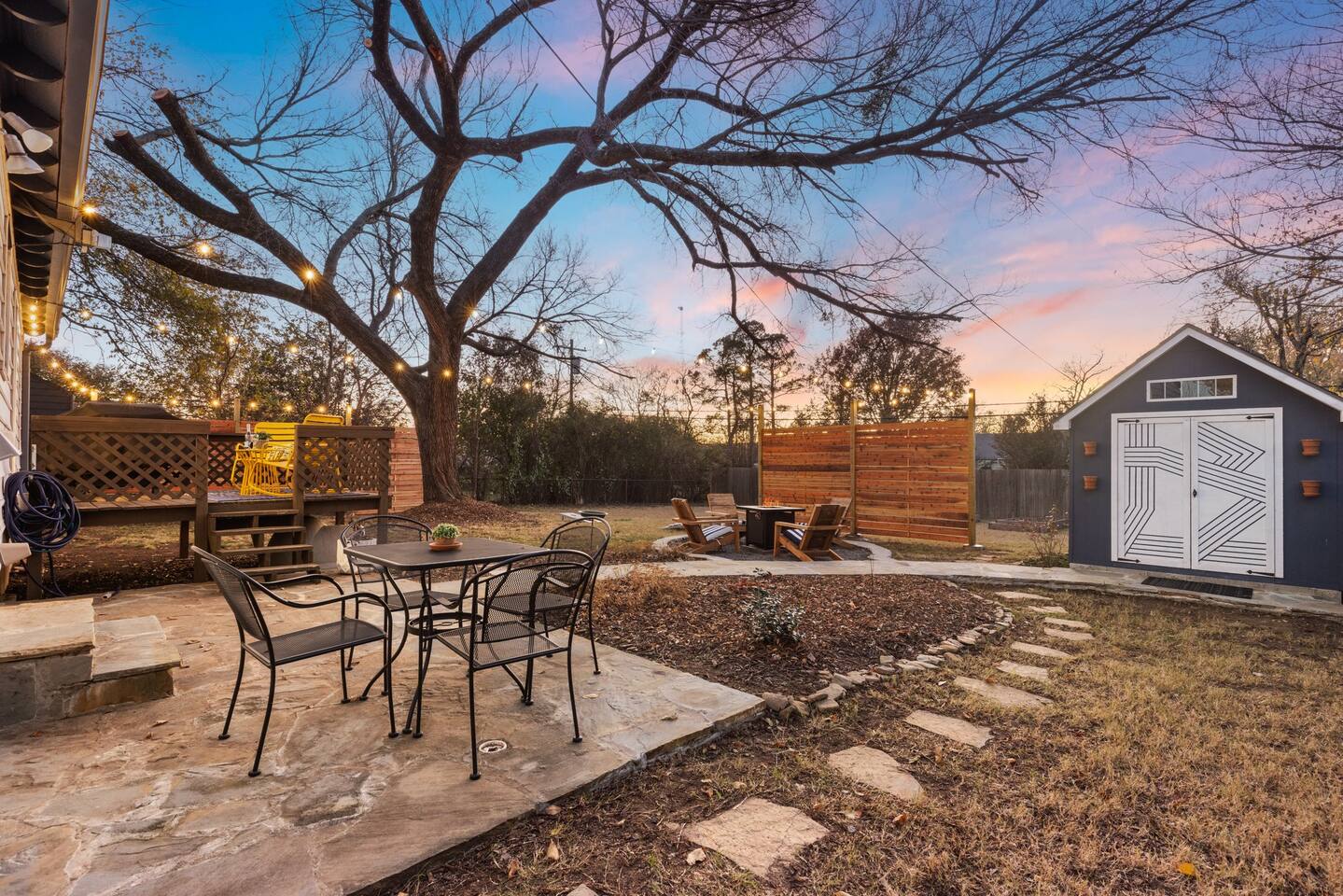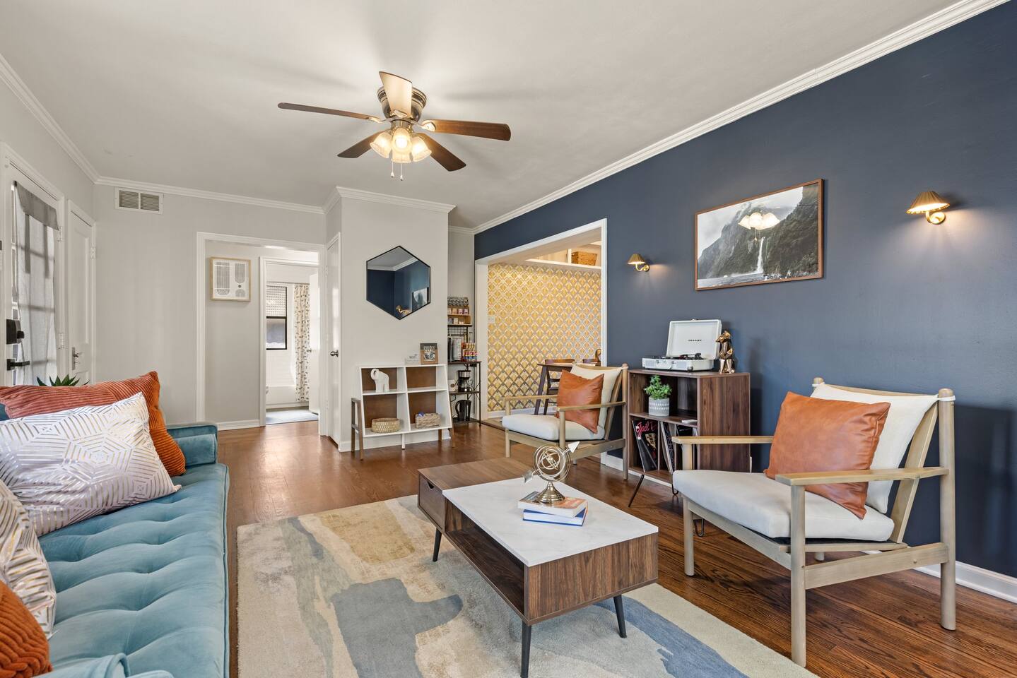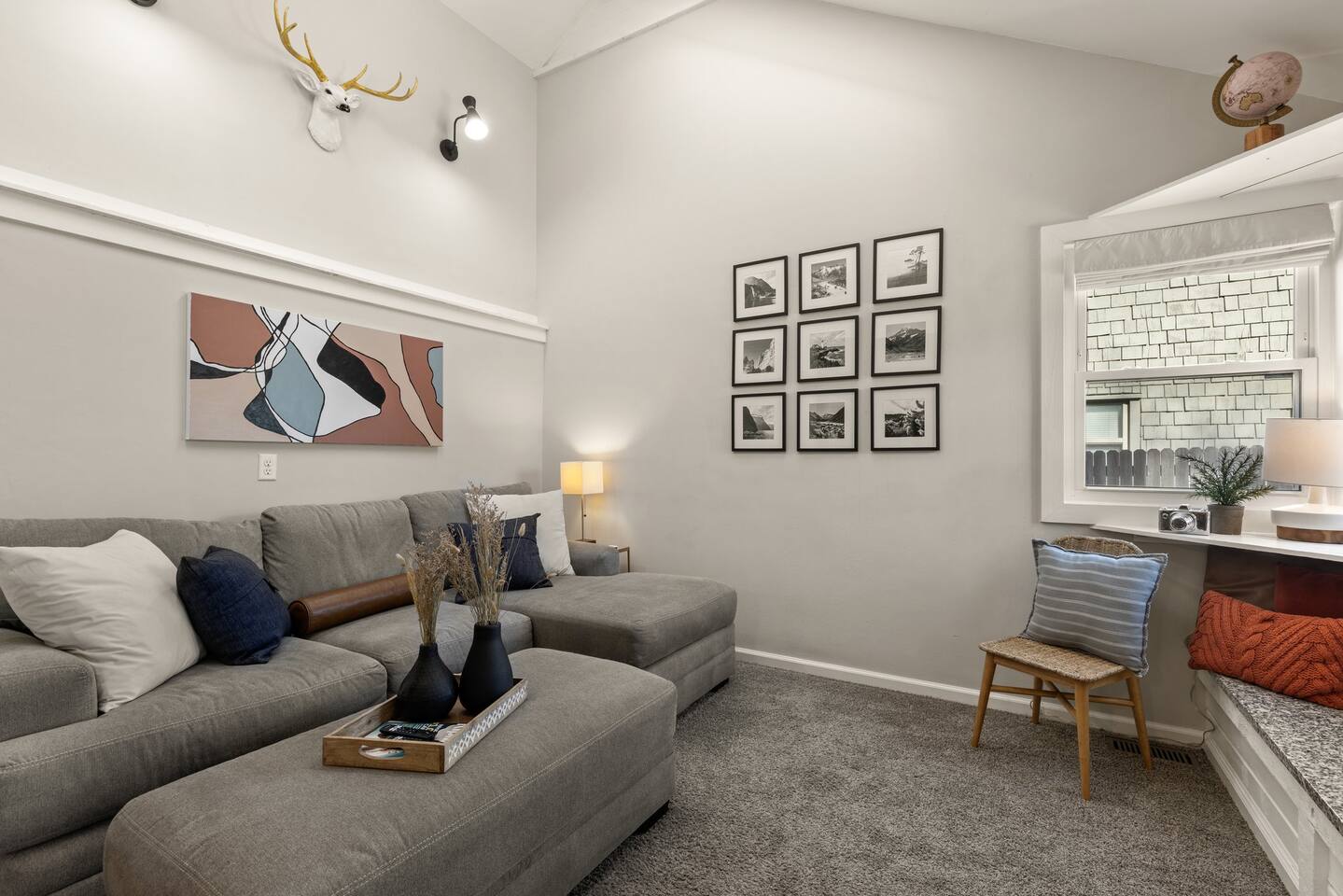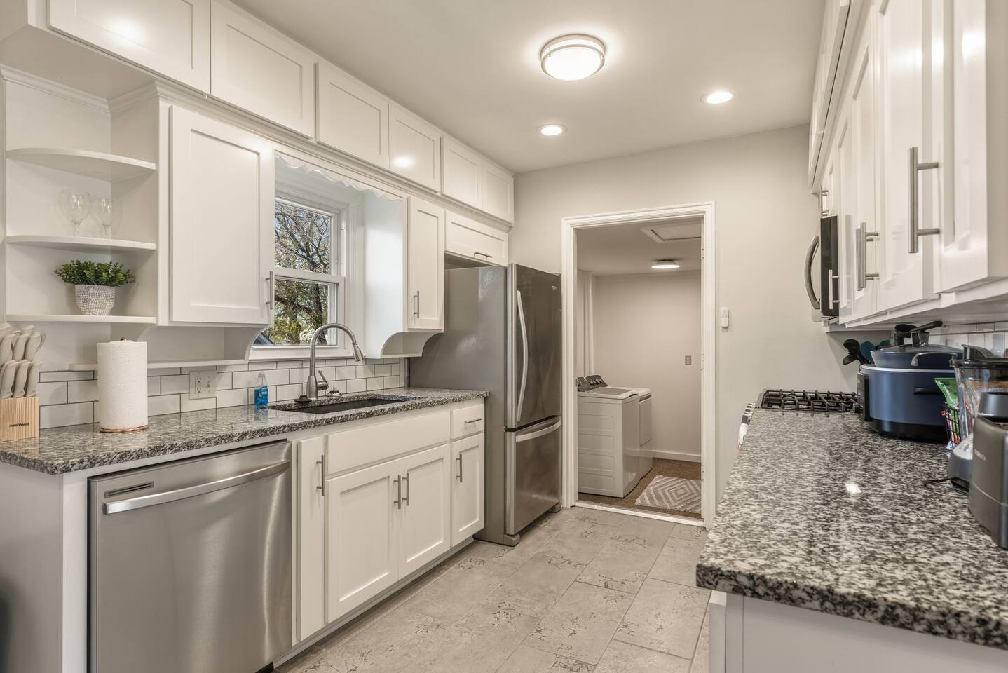 ~Living room~ There is a large smart TV that allows for unlimited streaming. There are two comfortably sofas, one of which is great for stretching out and relaxing like you are at home. WIFI- compatible with working remotely. Plenty of seating for all guests. There is a record player with fun albums available. plenty of throw pillows and blankets. Two additional blankets for your pet and an available dog bed if needed to have a nice space for your pet to rest near you. (Please note the fireplace is not functional) ~Kitchen & Dining~ Fully equipped kitchen, with every item we could think of to include to accommodate your stay. Fully stocked coffee & tea bar is included. variety of coffees including decaf, tea, honey, flavors, honey, cream, splenda and sugar. Board games stored in shelving in dining room. ~Bedroom One~ Queen size, very comfortable bed, closet, dresser, night stands, ceiling fan, chair, lamps. Accommodates 2 guests ~Bedroom Two~ Full over full trundle bed (two mattresses), very comfortable mattress, closet, ceiling fan, chair, lamp. Accommodates 4 guests. Playpen stored in this closet. ~Full Bathroom~ Located in the hall between two rooms. hairdryer available. Shower/tub located in the bathroom. ~Laundry room~ Washer and dryer with soap available for a few washes if needed as well as an iron. There is a small vacuum. mop and broom here. This room is just off of the Kitchen and located inside the home. Cornhole stored in laundry room. ~Outdoor Space~ Small deck off of kitchen, outdoor string lights, decorative privacy fencing. Fully fenced backyard. three different seating areas. Easy start firepit and propane BBQ grill just off kitchen on deck. Cornhole for a little fun is available. This is a very relaxing space after a busy day!
